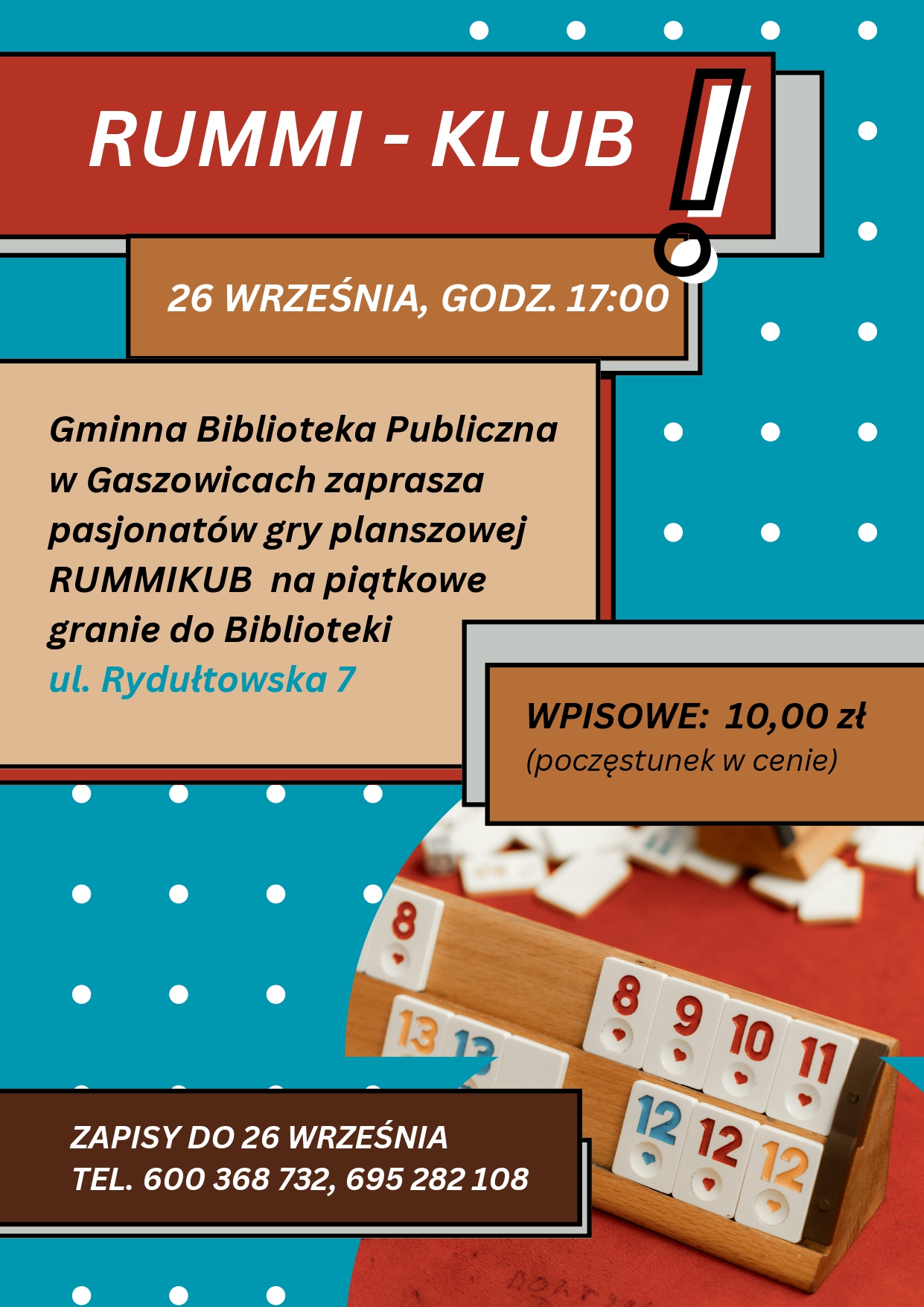 Rummi-klub – edycja wrześniowa 25 września 2025 Zapraszamy pasjonatów Rummikuba! kiedy: 26 września, godz. 17:00 gdzie: Biblioteka – ul. Rydułtowska 7 zapisy: tel.: 600 368 732, 695 282 108 (do 26 września) wpisowe: 10 zł